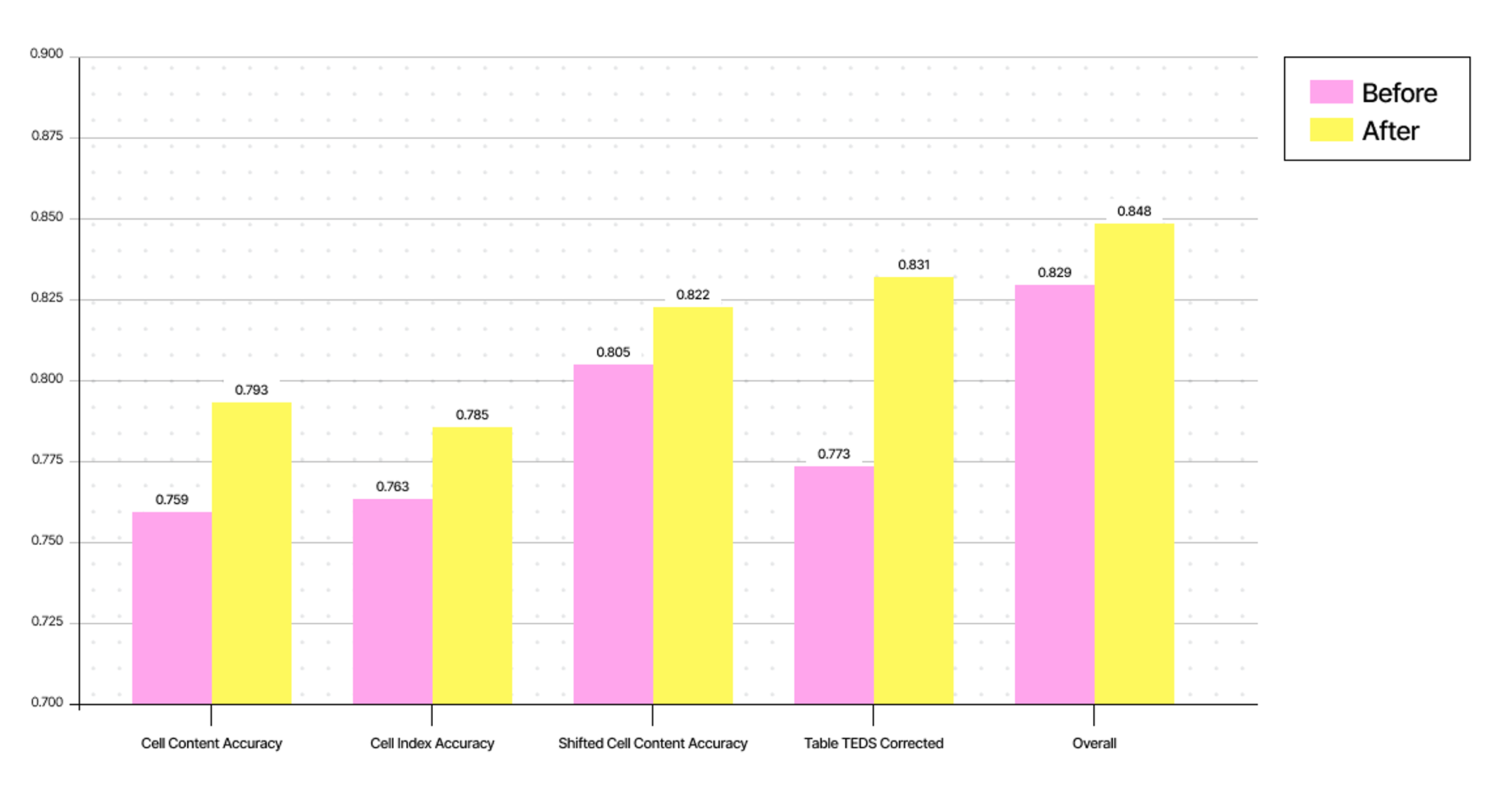 The improvements are particularly notable in structural understanding. Cell level index accuracy—the ability to correctly map content to its position in the table—improved by nearly 3%. Table TEDS Corrected showed a 7.5% improvement, indicating better preservation of table hierarchies and relationships.